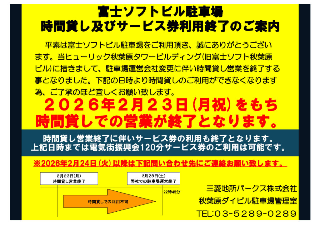 これにあわせて、秋葉原電気街振興会の一部加盟店が発行する駐車場サービス券の、「富士ソフトビル駐車場」でのご利用も、2026年2月23日(月・祝)をもって終了することになりました。