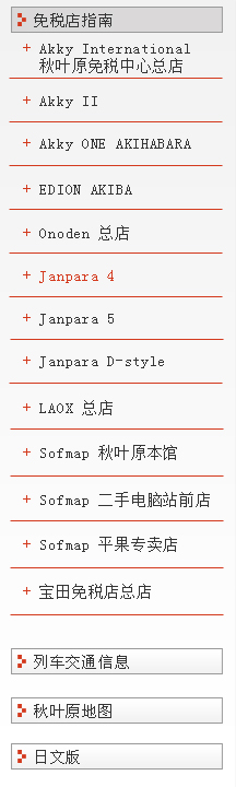| 地址:东京都千代田区神田佐久間町1-17-1F 邮编:101-0025 电话号码:03-5289-8930 营业时间:10:30~19:30 休息时间:年中无休 可使用语言:英文、中文 URL:http://www.janpara.co.jp/ |