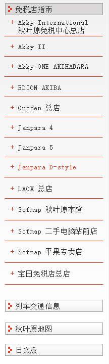 | 地址:东京都千代田区外神田1-16-10-1F 邮编:101-0021 电话号码:03-5209-2731 营业时间:平日 11:00~20:00/周末,节假日:10:30~19:30 休息时间:年中无休 可使用语言:英文、中文 URL:http://www.janpara.co.jp/ |