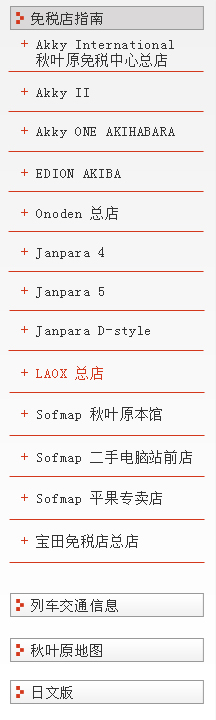 | 地址:东京都千代田区外神田1-2-9 邮编:101-0021 电话号码:03-3253-7111 营业时间:10:00~20:00 休息时间:无休 可使用语言:英文、中文、韩文、孟加拉语、葡萄牙语、西班牙语、俄语、波斯语、印度语、乌尔都语、缅甸语、尼泊尔语 URL:http://www.laox.co.jp/ |